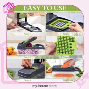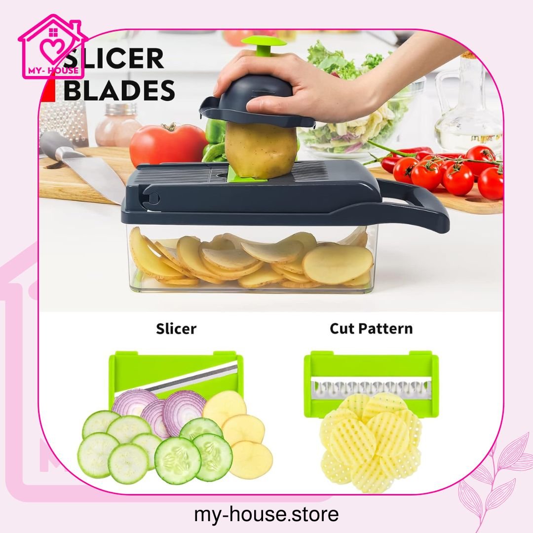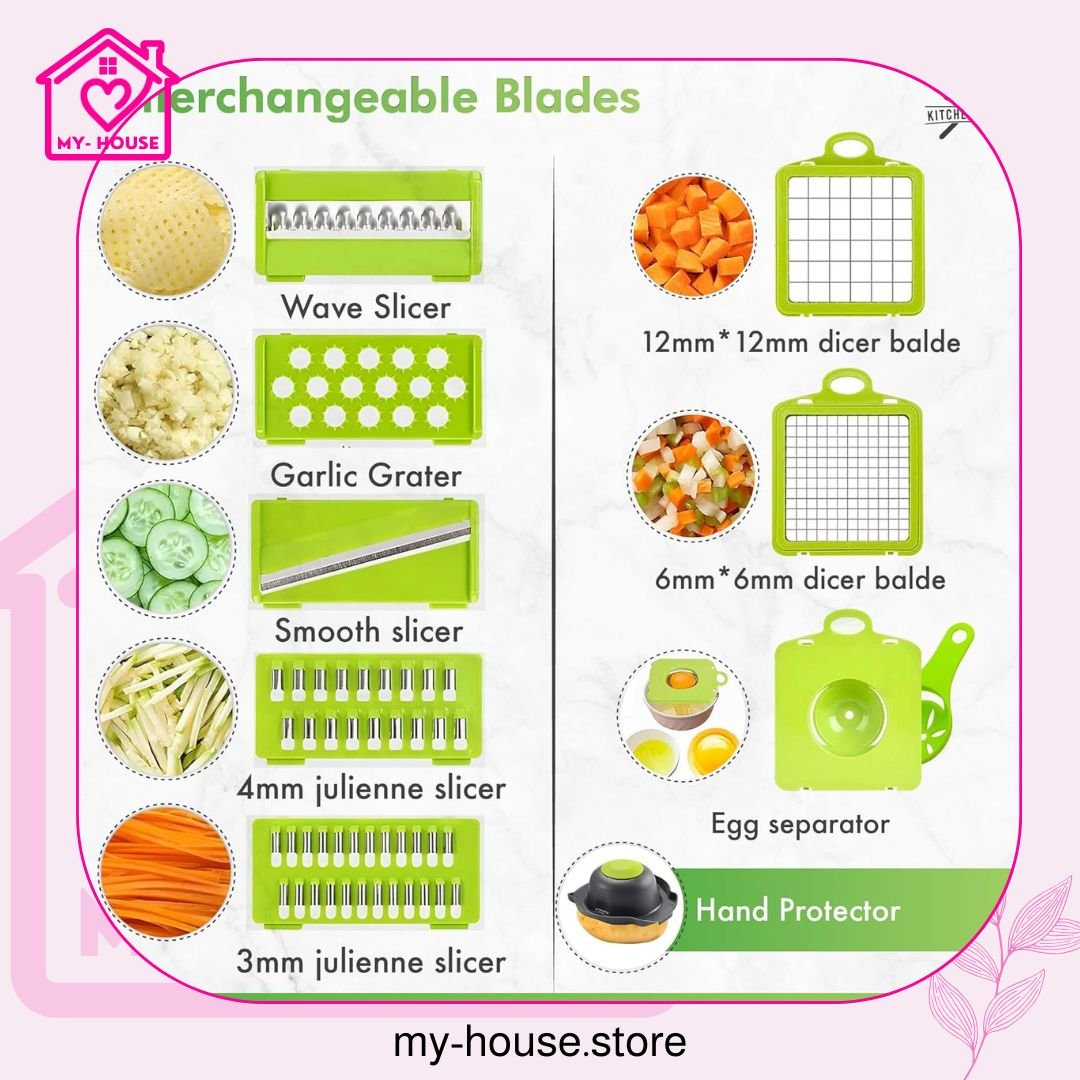 إليك وصفًا إعلانيًا لقطاعة قطاعة الخضار اليدوية 14 في 1