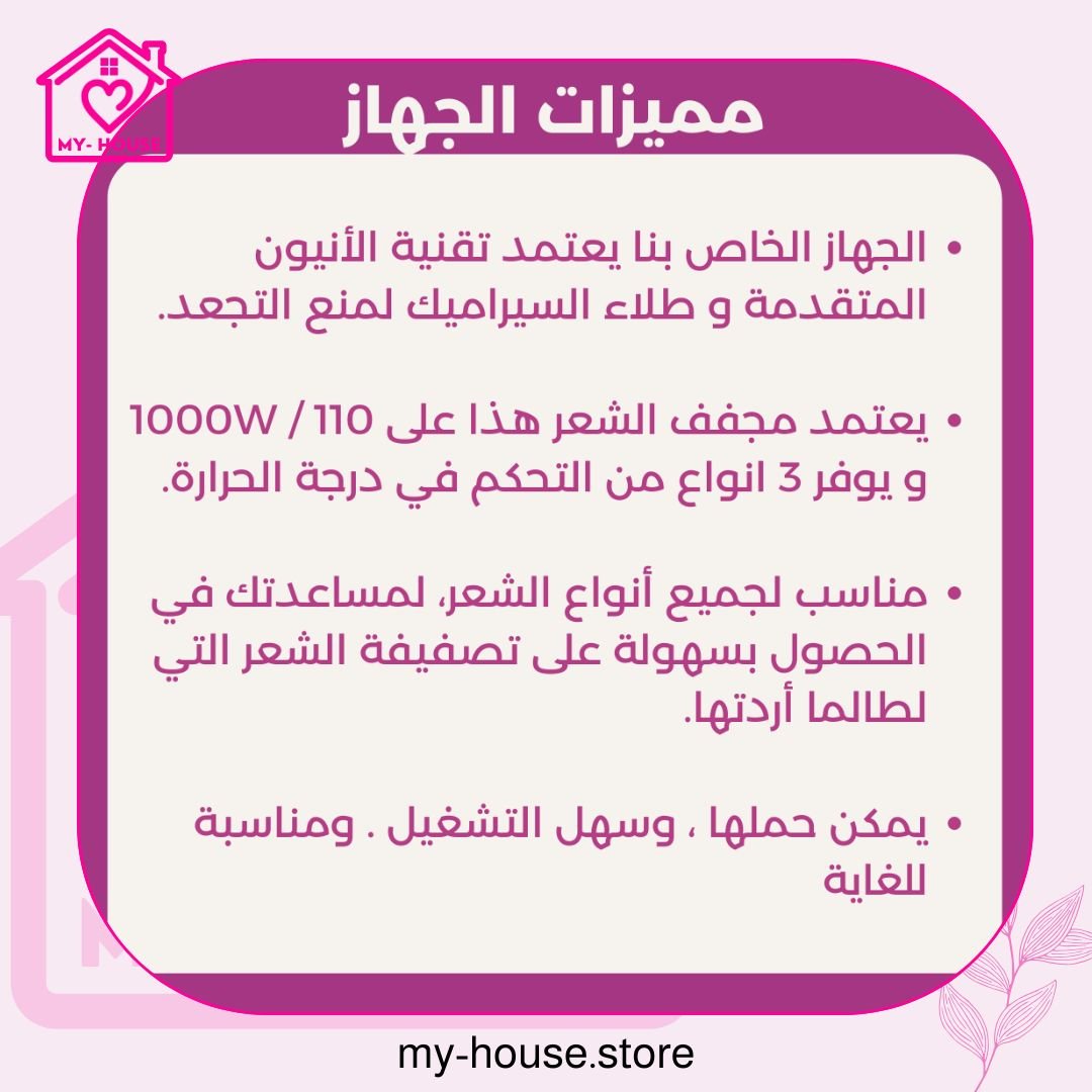 مزودة بتقنية الأيونات السالبة التي تحمي شعركِ من التجعد والكهرباء الساكنة، مما يمنحكِ تصفيفاً آمناً ونتائج مبهرة دون أي ضرر.